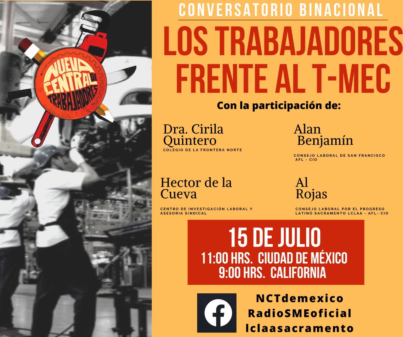 This event had a binational character. The participants from Mexico were Dr. Cirila Quintero, researcher at the Colegio de la Frontera Norte, and Hector de la Cueva, coordinator of CILAS [Labor Research and Trade Union Advisory Center]. U.S. participants were Alan Benjamin, union delegate to the San Francisco Labor Council (AFL CIO), and Al Rojas, vice president of the Labor Council for Latin American Advancement, LCLAA – Sacramento chapter. The forum was broadcast on Facebook live. Members of the NCT National Executive Committee participated through the Zoom platform.